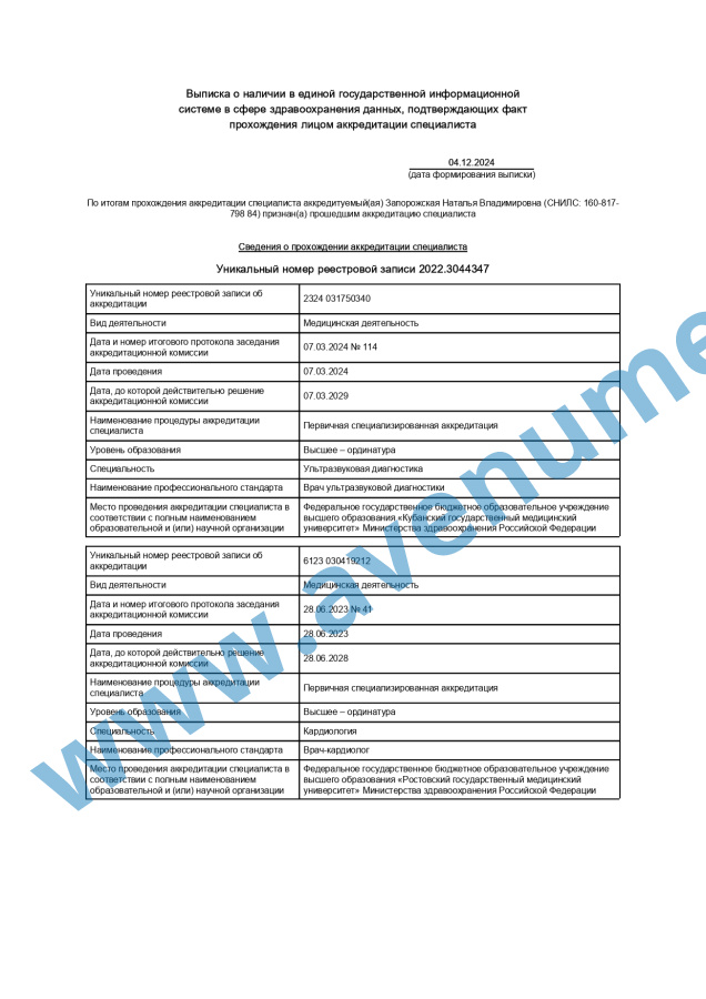 • 2023 г. - Академия повышения квалификации и профессиональной переподготовки, переподготовка по программе "Ультразвуковая диагностика".