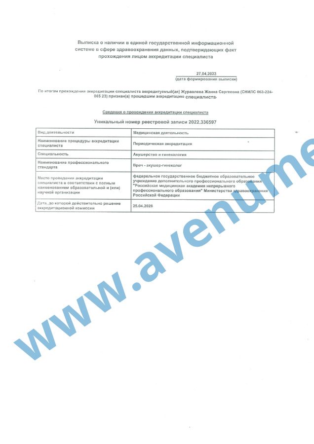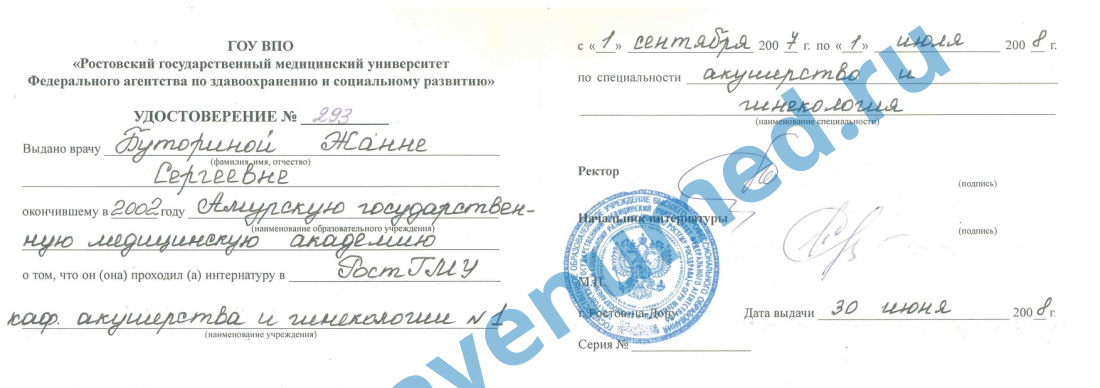 - 2008 г. - интернатура в РостГМУ по специальности "Акушерство и гинекология".